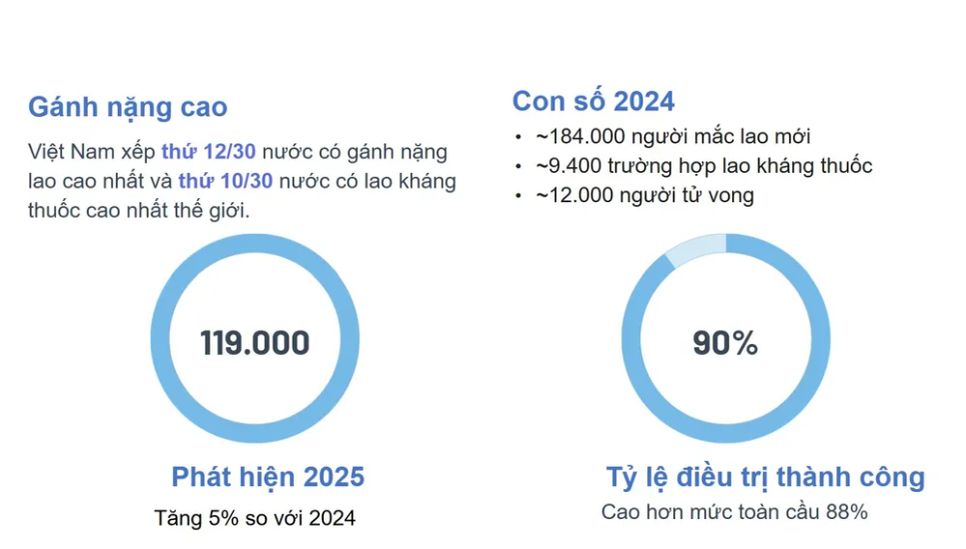 Theo báo cáo của Chương trình Chống lao quốc gia, năm 2025, cả nước phát hiện hơn 119.000 bệnh nhân lao, tăng 5% so với năm 2024. Tỷ lệ bệnh nhân lao có bằng chứng vi khuẩn học là 75%. Tỷ lệ điều trị thành công đạt 90%, cao hơn mức trung bình toàn cầu là 88%. Tuy nhiên, gánh nặng bệnh lao tại Việt Nam vẫn rất lớn.