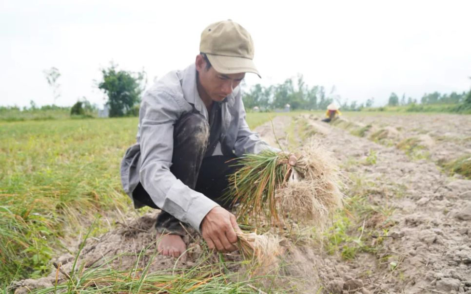 Anh Lê Văn Hồng (43 tuổi, thôn Vạn Ninh 1, xã Phù Mỹ Nam) đang canh tác 3 sào kiệu tết. Dù thời tiết bất lợi, giá cả bấp bênh, nhưng cuối năm có thu nhập vớt vát những tháng khó khăn sau bão lũ.